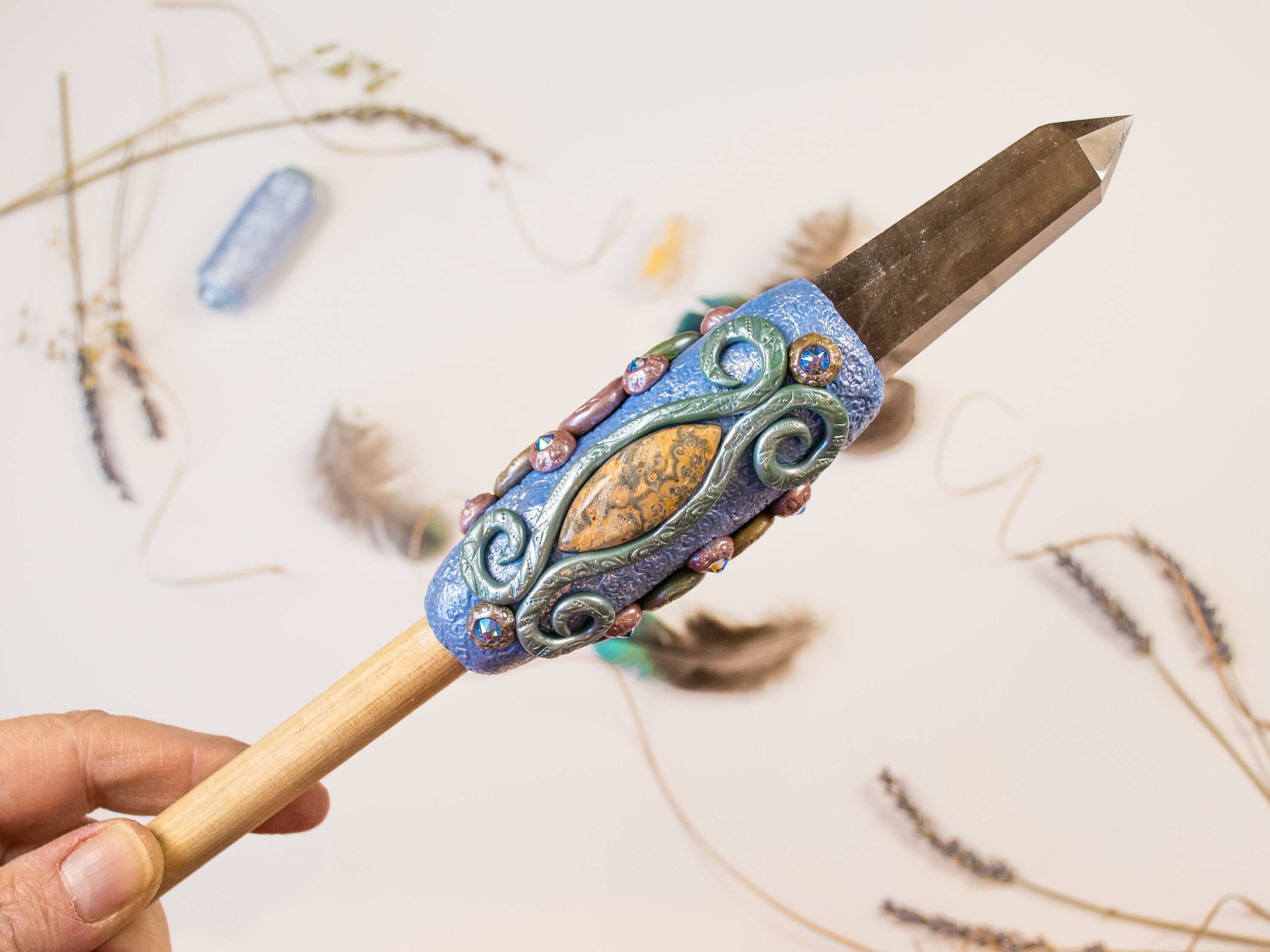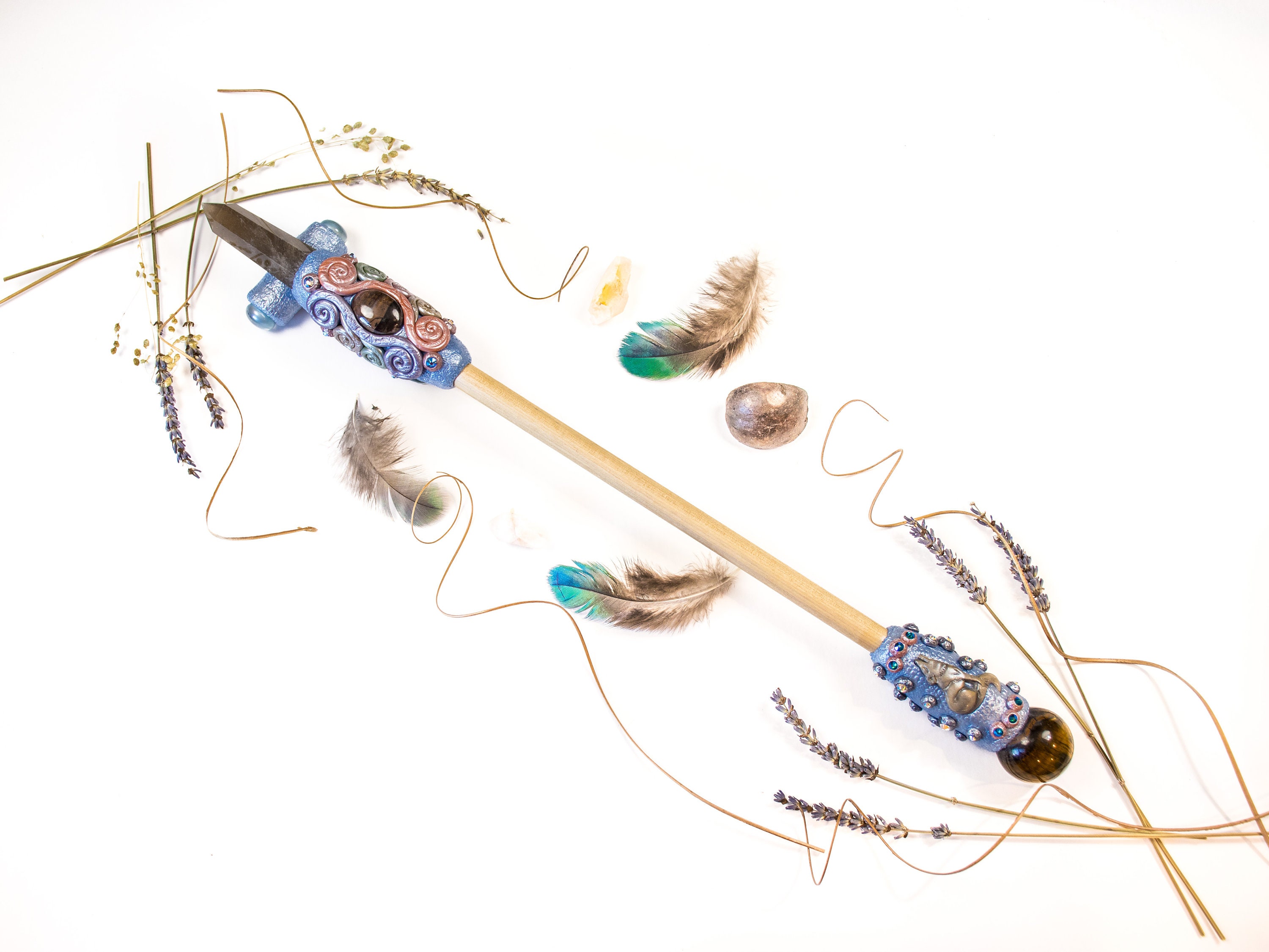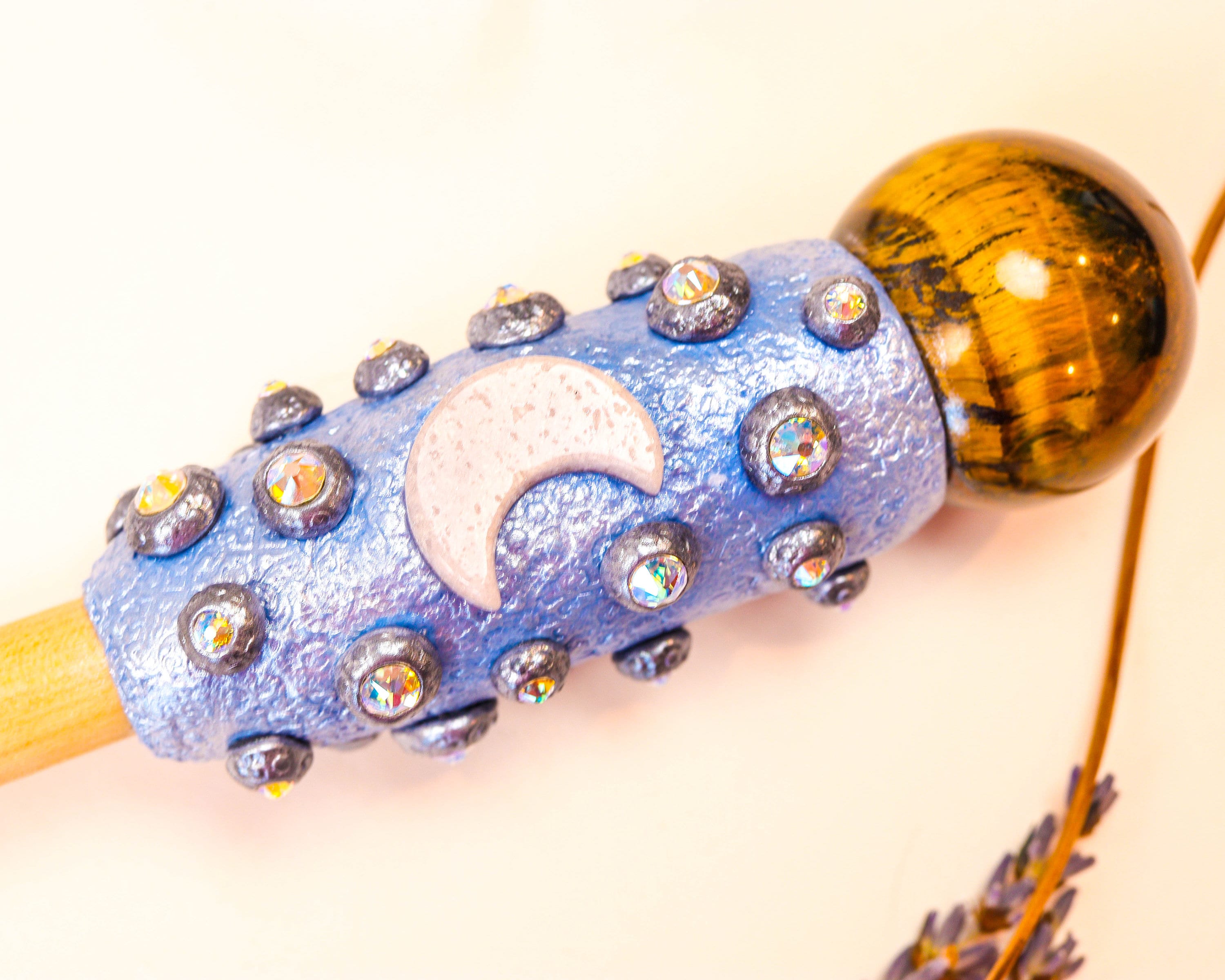 ✨ Measurements: Wand Length: 18 ½ inches (1 ½ inches at widest point), Wand Rest: 2 ½ inches long, ⅞ inch wide, accented with blue glass cabochons