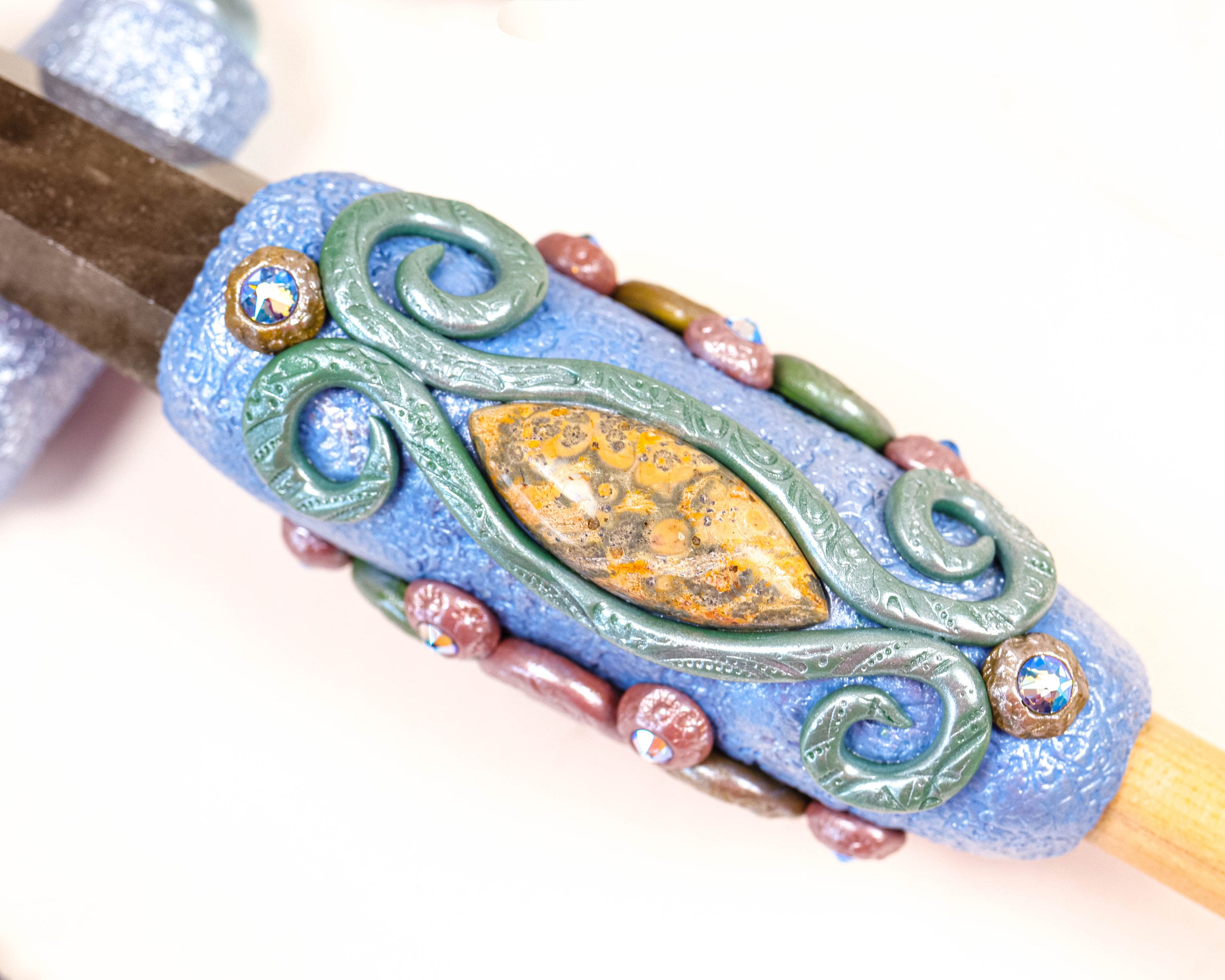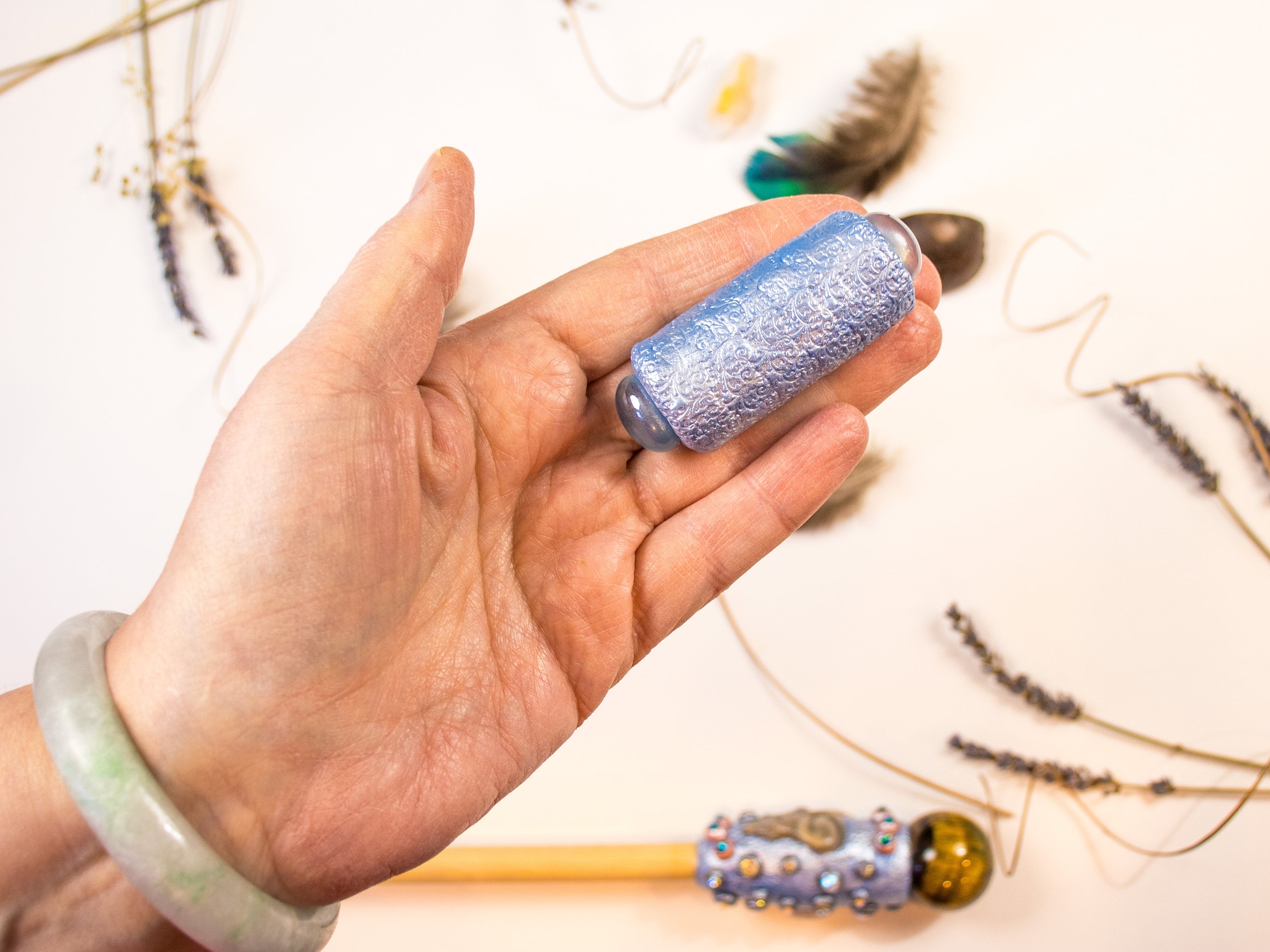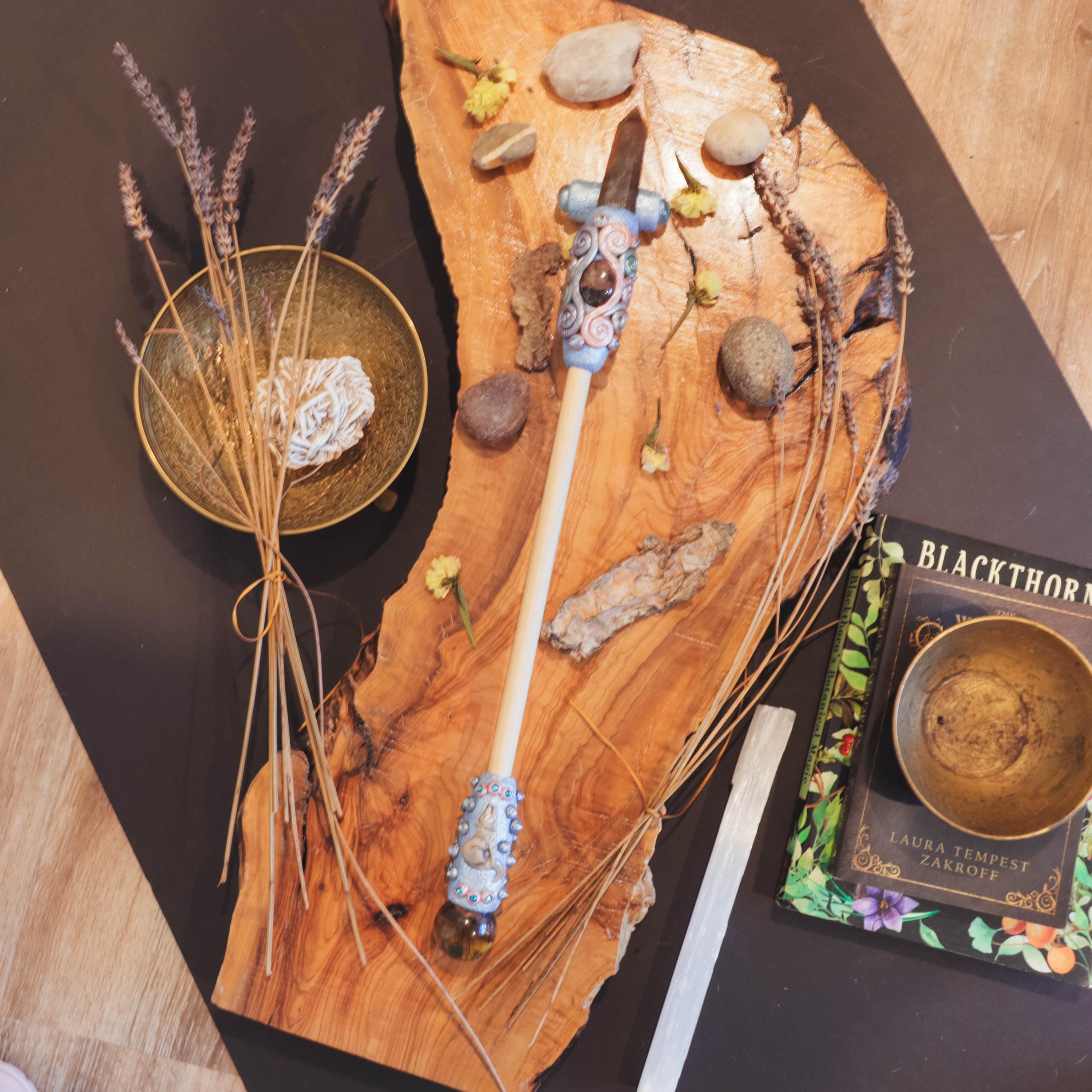 Blue Glass Cabochons (Wand Rest): A subtle touch of protection and serenity, reflecting the calming qualities of water and sky.