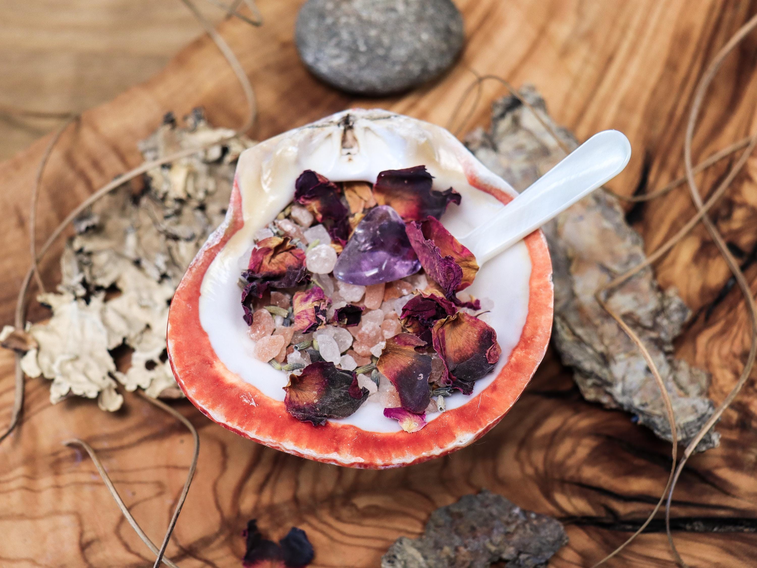 The Salt within the Spiny Oyster Shell is a very special and rare Himalayan Salt, infused with the natural forces of the Cosmos. This rare batch has sat under the light of 19 Full Moons, basking in the lunar glow and gathering the essence of each celestial cycle. Additionally, this salt has been energized by the extraordinary alignment of the Comet on 1/23/23 and the Solar Eclipse on April 8, 2024, making it a truly cosmic offering. Added to that are dried rose petals, lavender and an Amethyst stone. All of the Full moons are listed here: