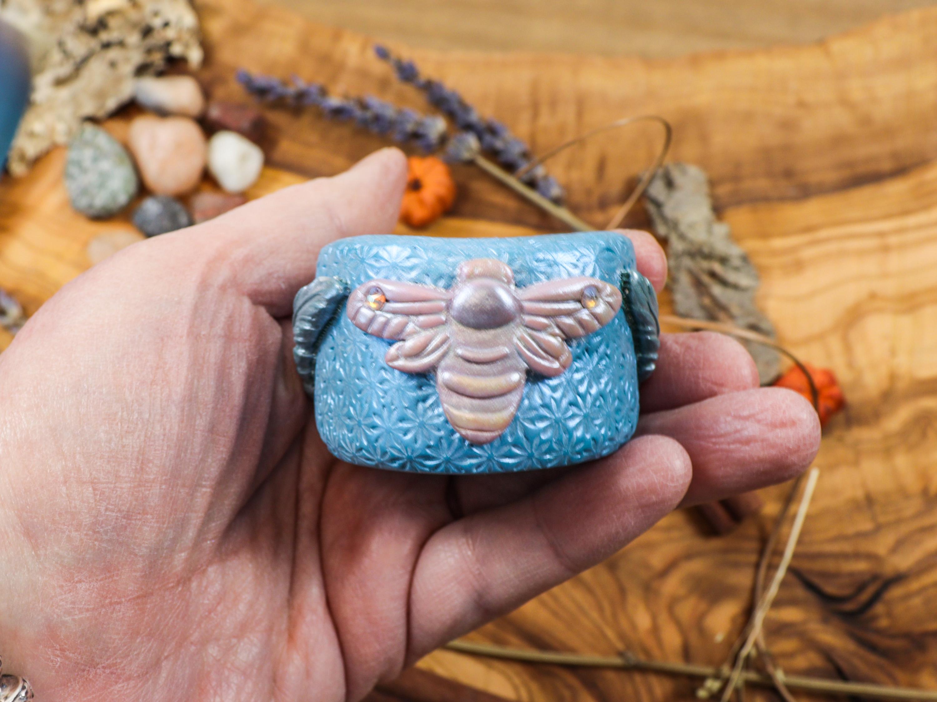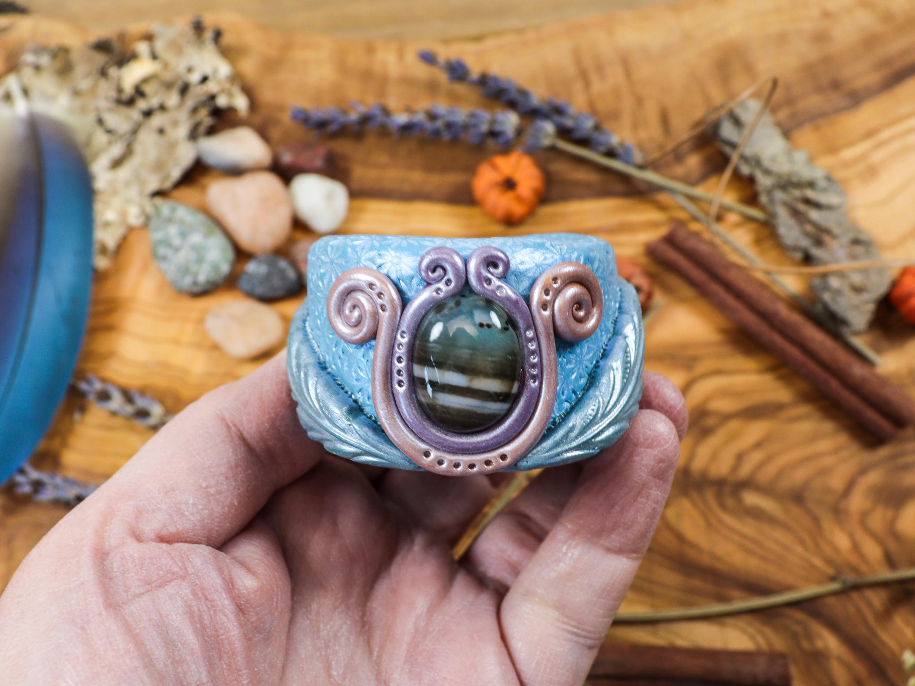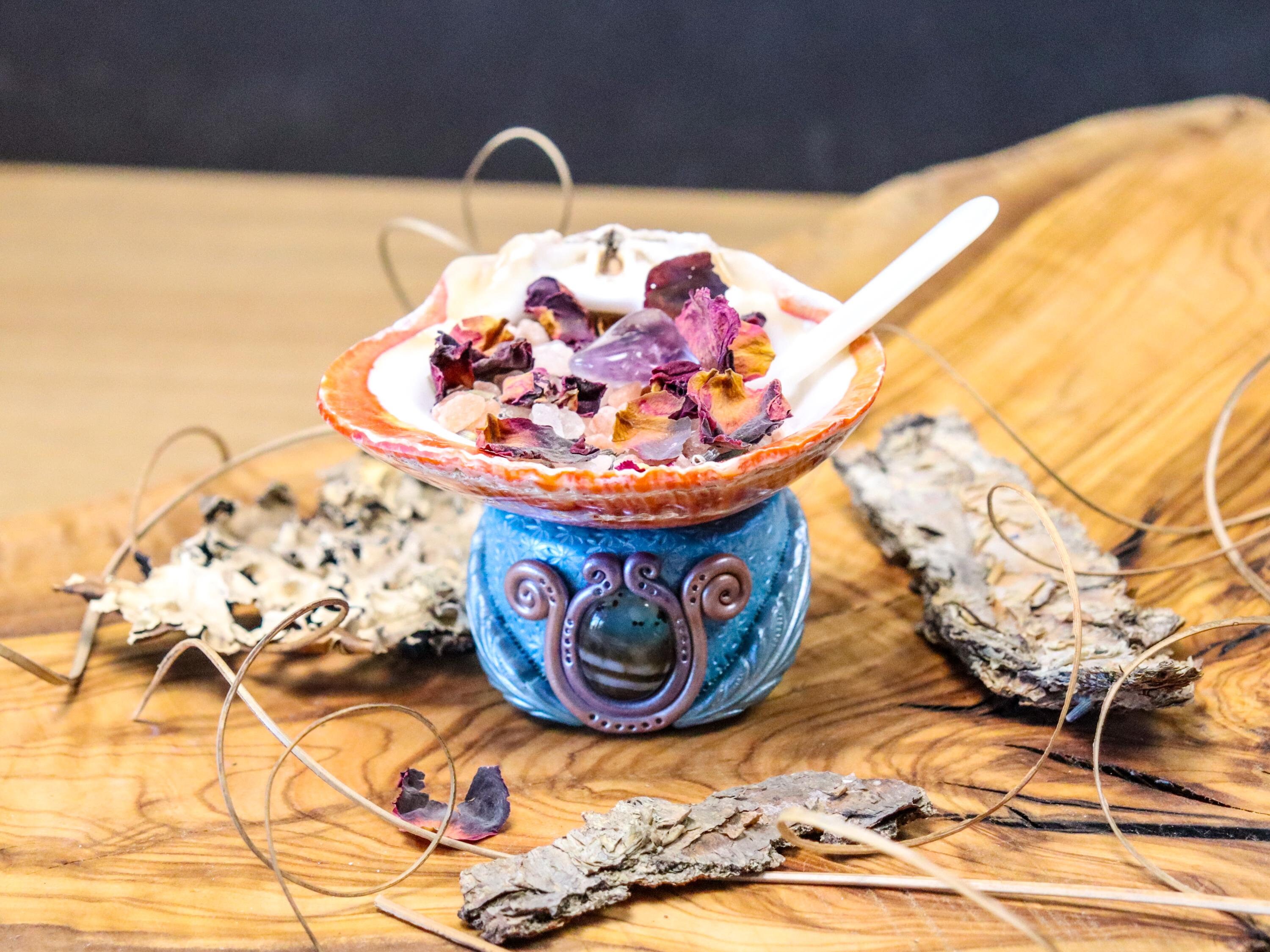 This unique Spiny Oyster Shell Salt Holder is a stunning blend of natural beauty and was made intuitively. If you are drawn to it, you can consider it magically created just for you. It is crafted from a vibrant natural Spiny Oyster Shell, known for its rich hues and textured surface. It rests on a handmade base showcasing a beautiful Banded Agate, a stone admired for its distinctive layers and grounding energy. At the back of the holder, there is a Bee, symbolizing the Greek Goddess Artemis, representing nature, fertility, and the cycles of life. Accompanying the salt holder is a delicate mother-of-pearl spoon, perfect for elegantly scooping a magical Salt Offering Blend of Full Moon Himalayan Salt, dried rose petals, lavender, and an Amethyst stone.
