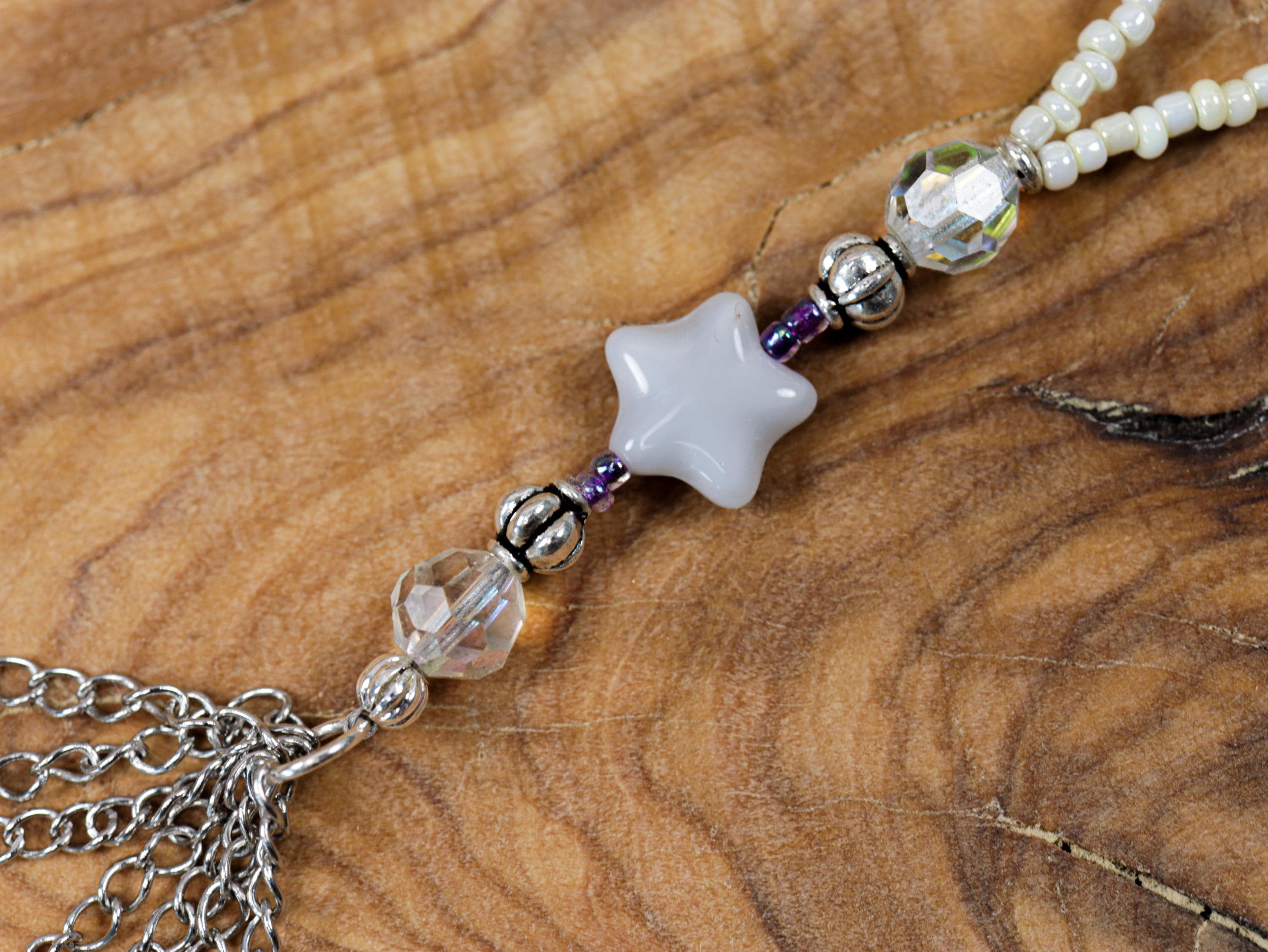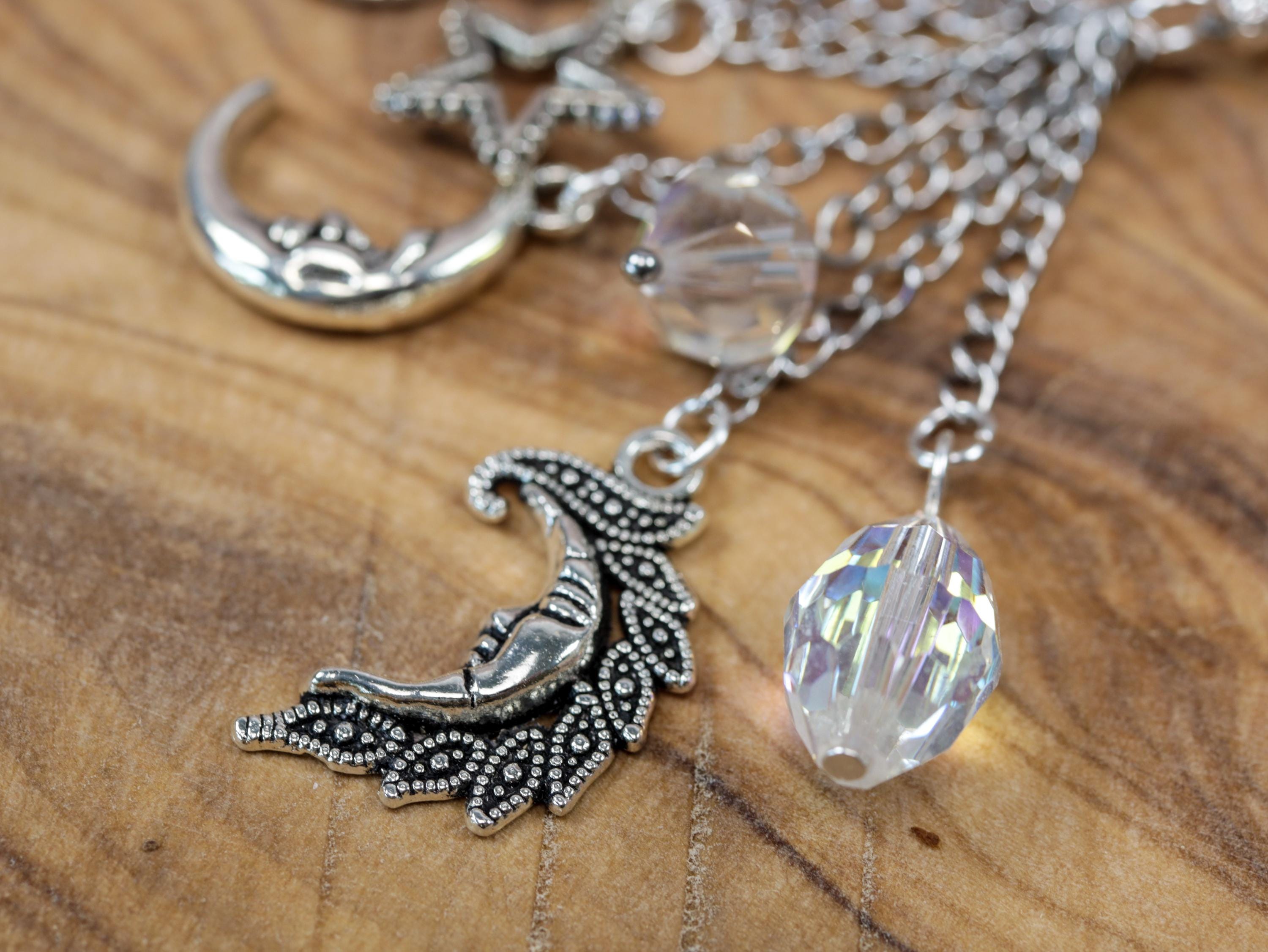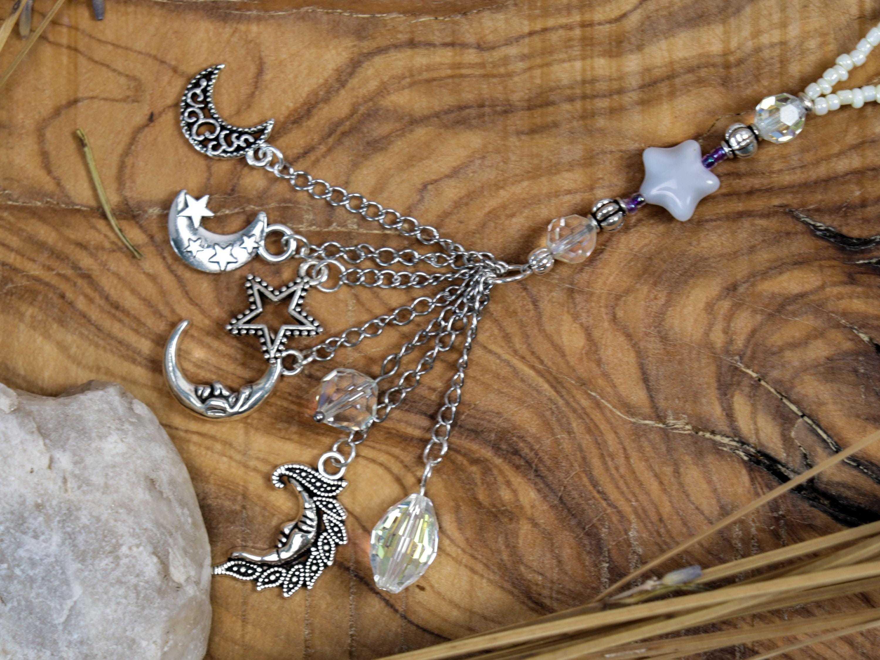 🌕 Celestial Charms & Details – A crescent moon, star charms, and shimmering crystals dangle from the strand, evoking the night sky and guiding your spiritual journey.