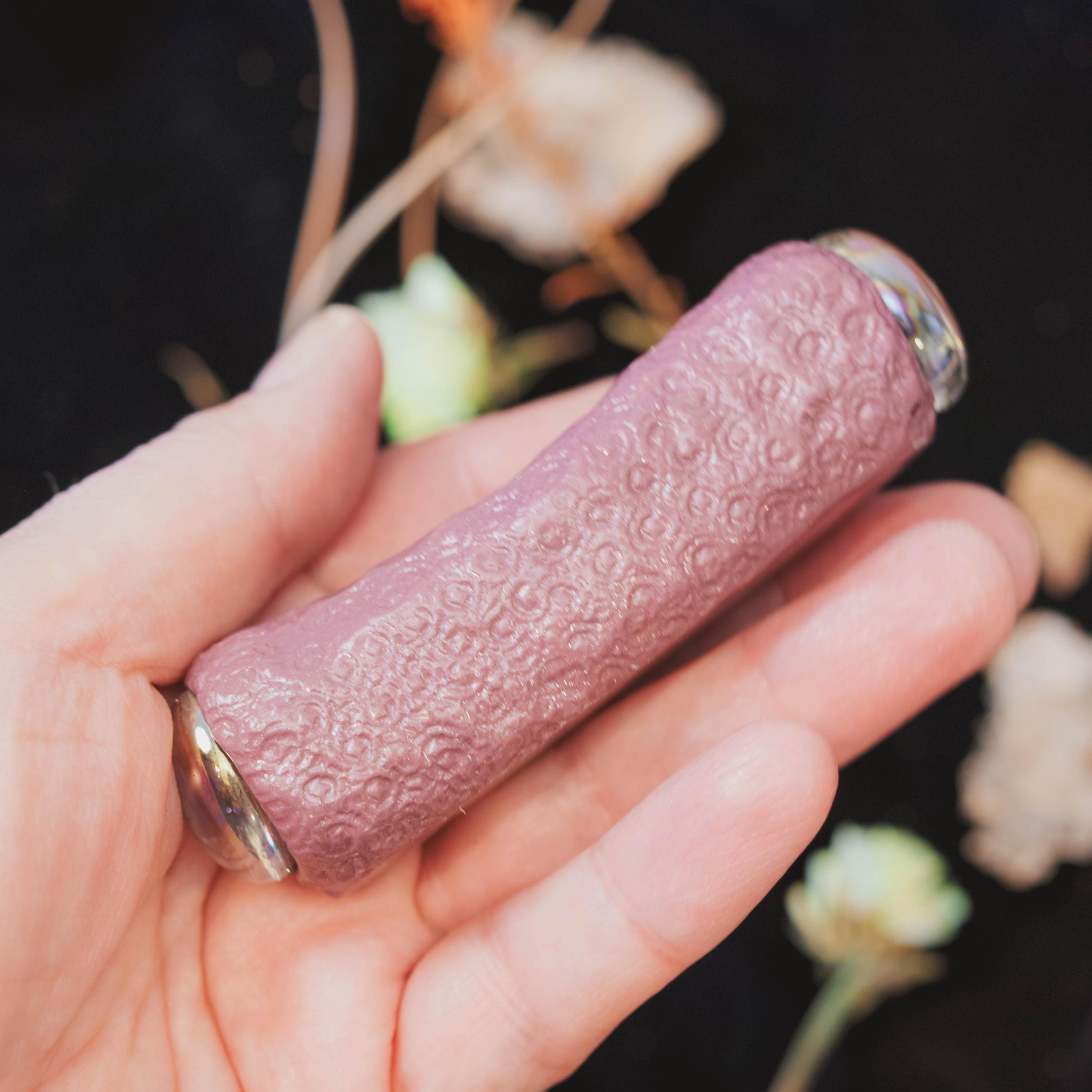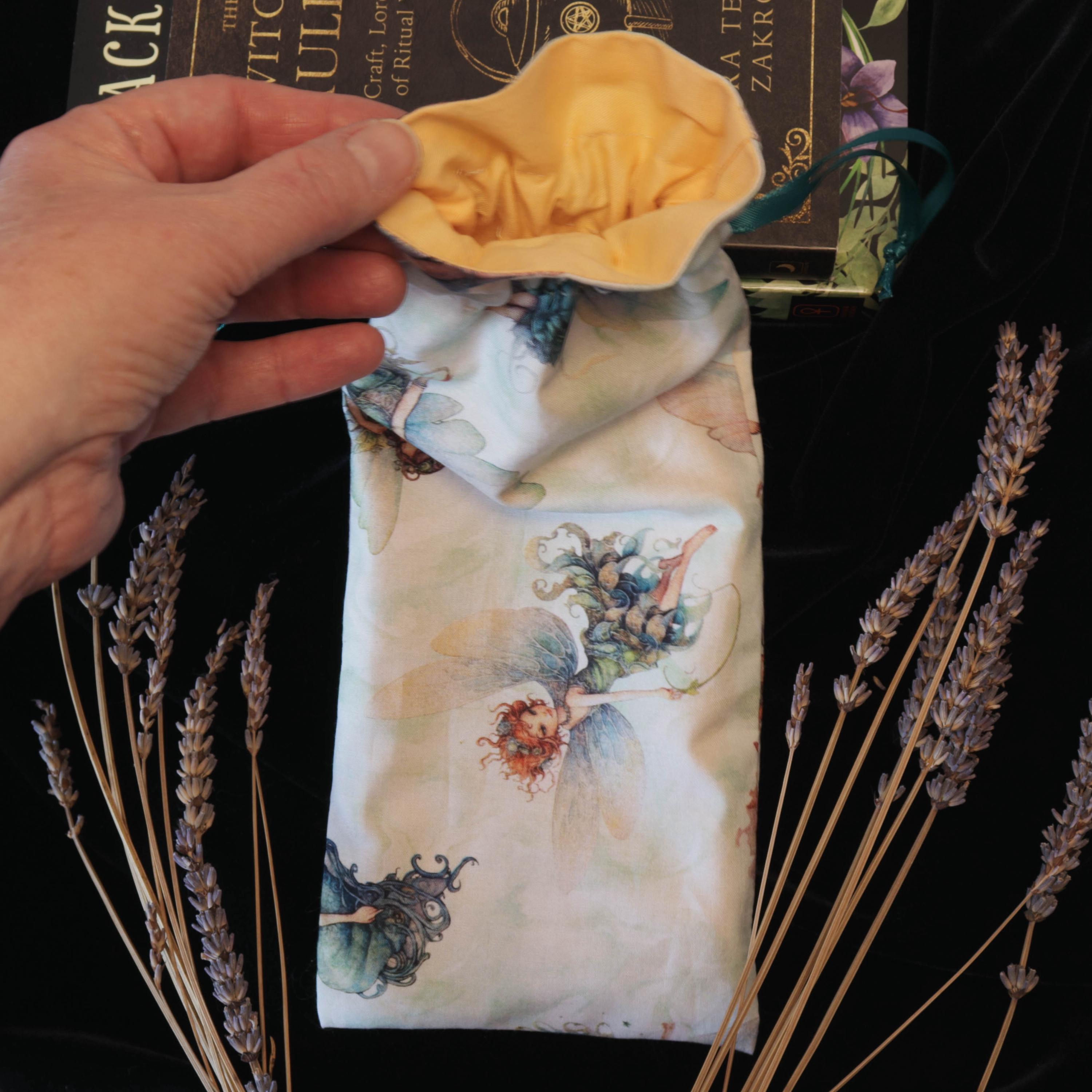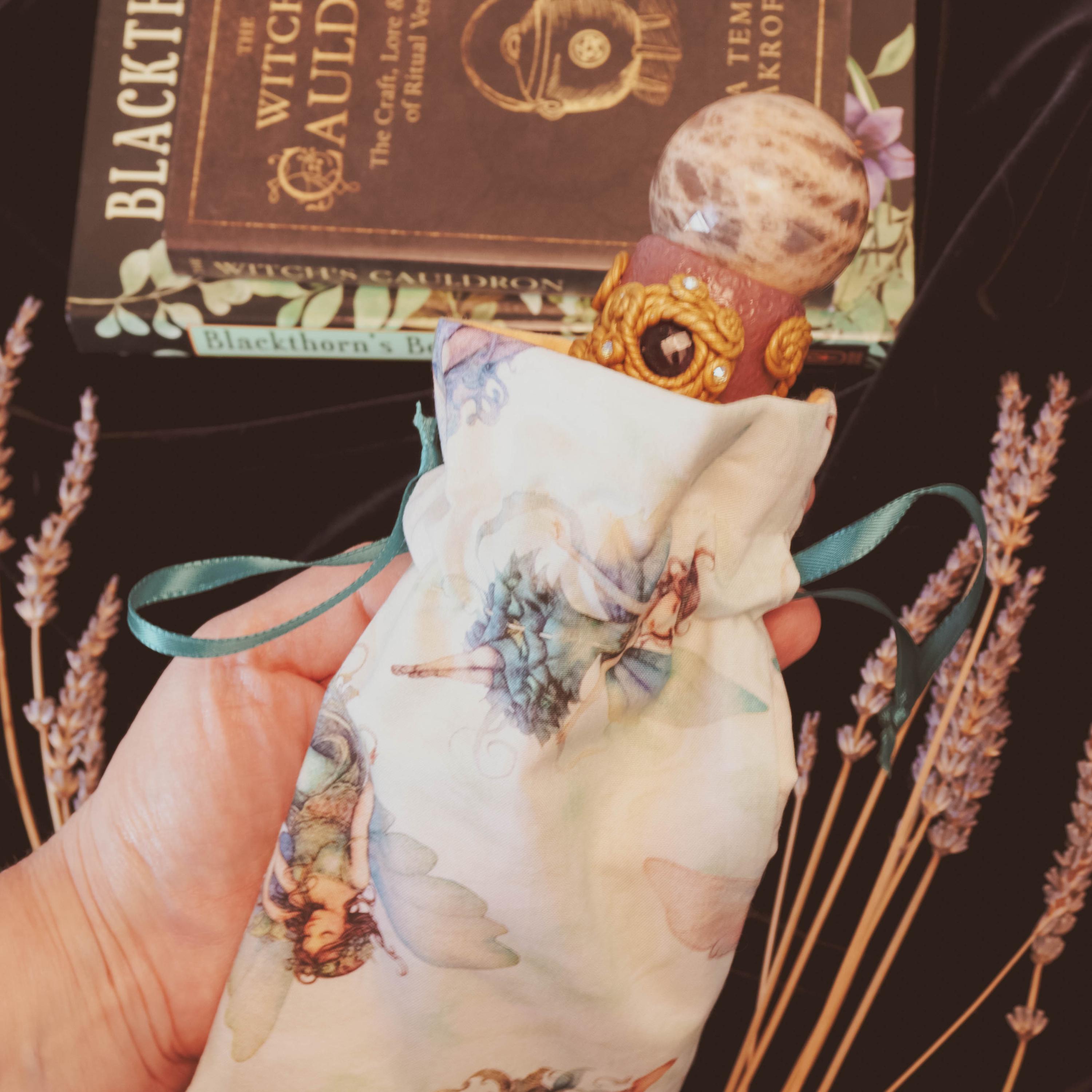 The matching wand rest, detailed with glass discs at each end, provides a beautiful and energetic resting place for your sacred tool when not in use. This powerful wand is also accompanied by a handmade, fully lined, drawstring pouch adorned with winged fairies, created as a One-of-a-Kind piece by Twilight CrystalCraft — the perfect enchanted home for your wand, infused with care, intention, and magic.