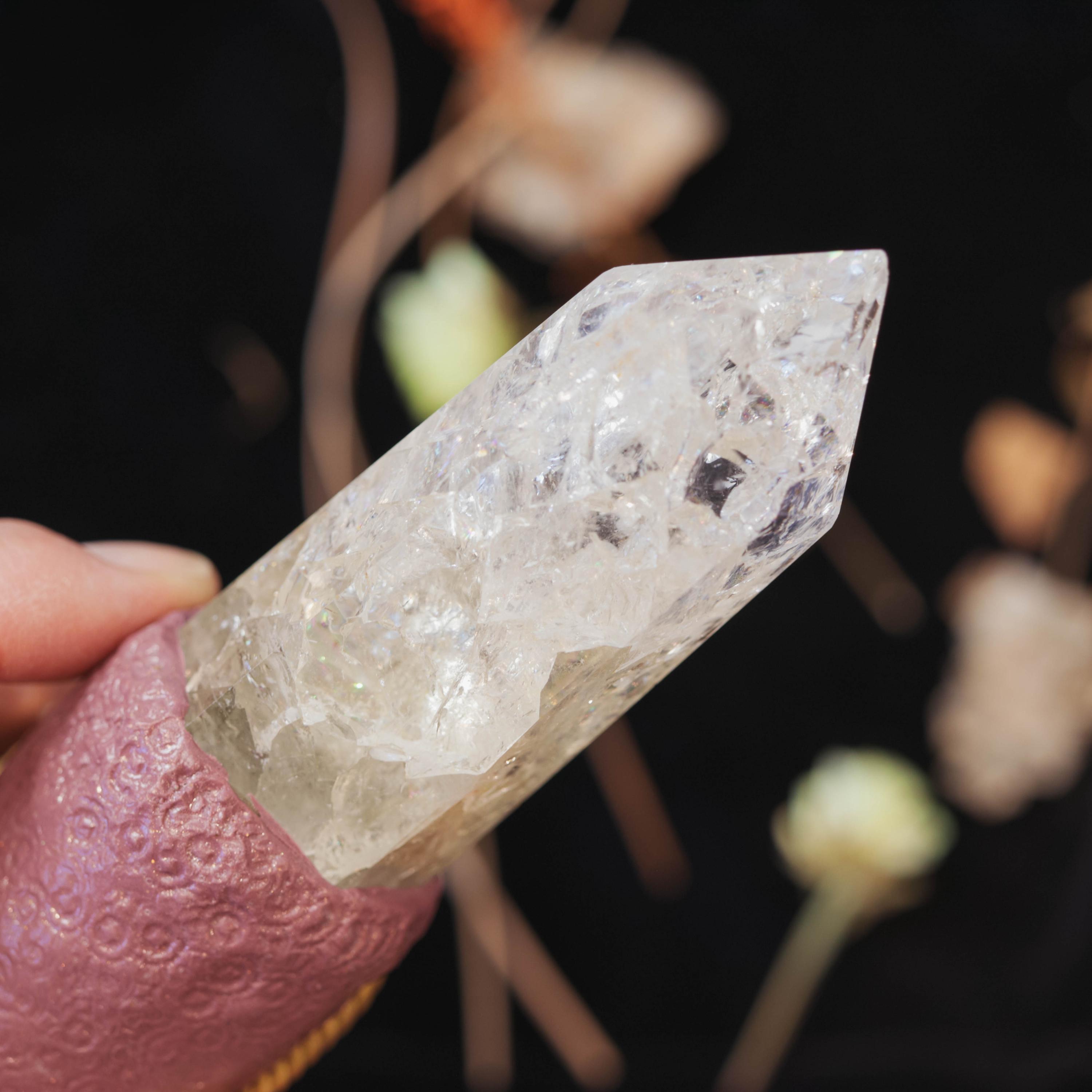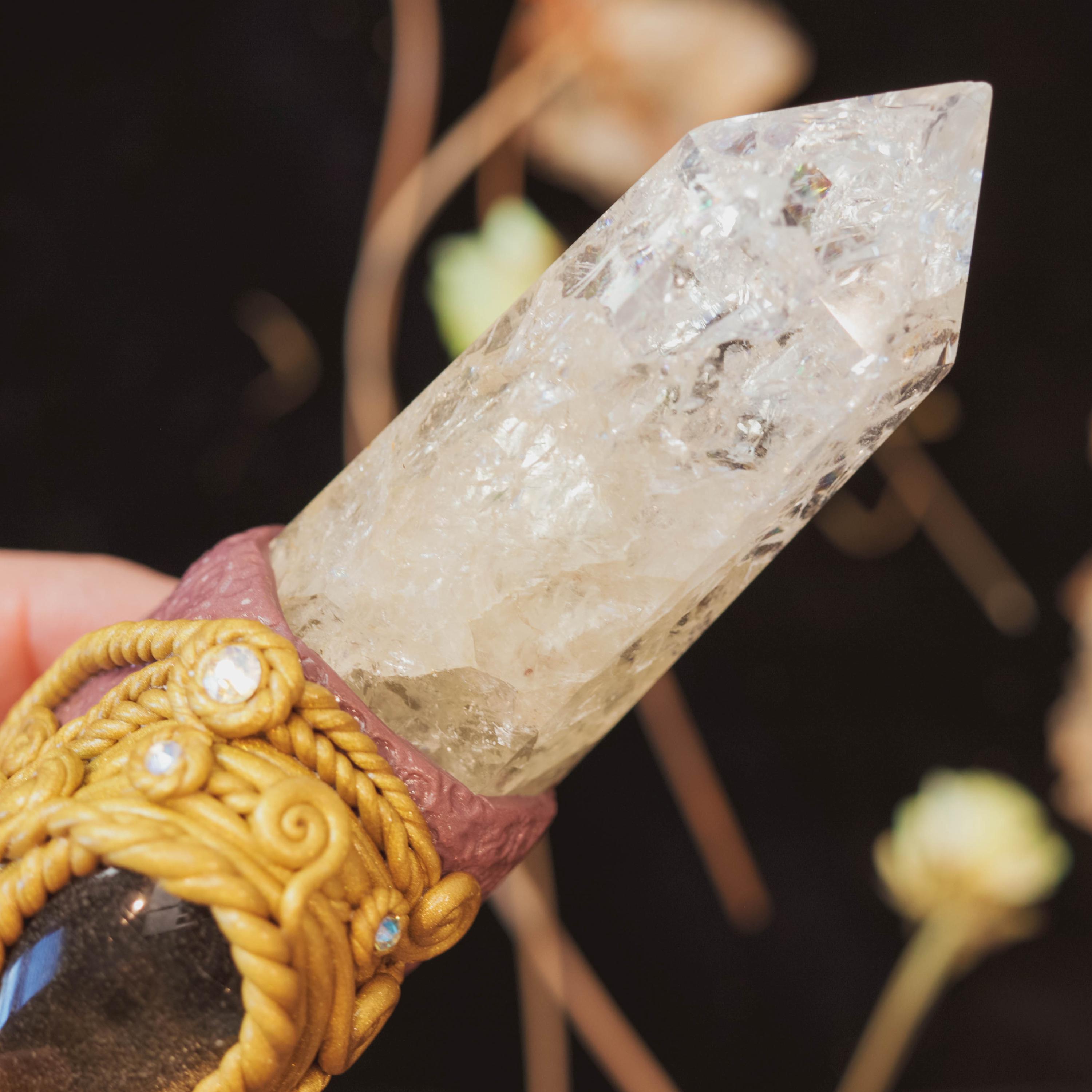❤️At the base is a striking Crackle Quartz polished point, shimmering in an ombre blend of Citrine to Clear Quartz. Citrine radiates warmth, abundance, and manifestation, transforming intention into reality. Clear Quartz amplifies all energies, bringing clarity, purification, and spiritual expansion. Their merging symbolizes the journey from the spark of intention (Citrine) into full illumination (Clear Quartz).