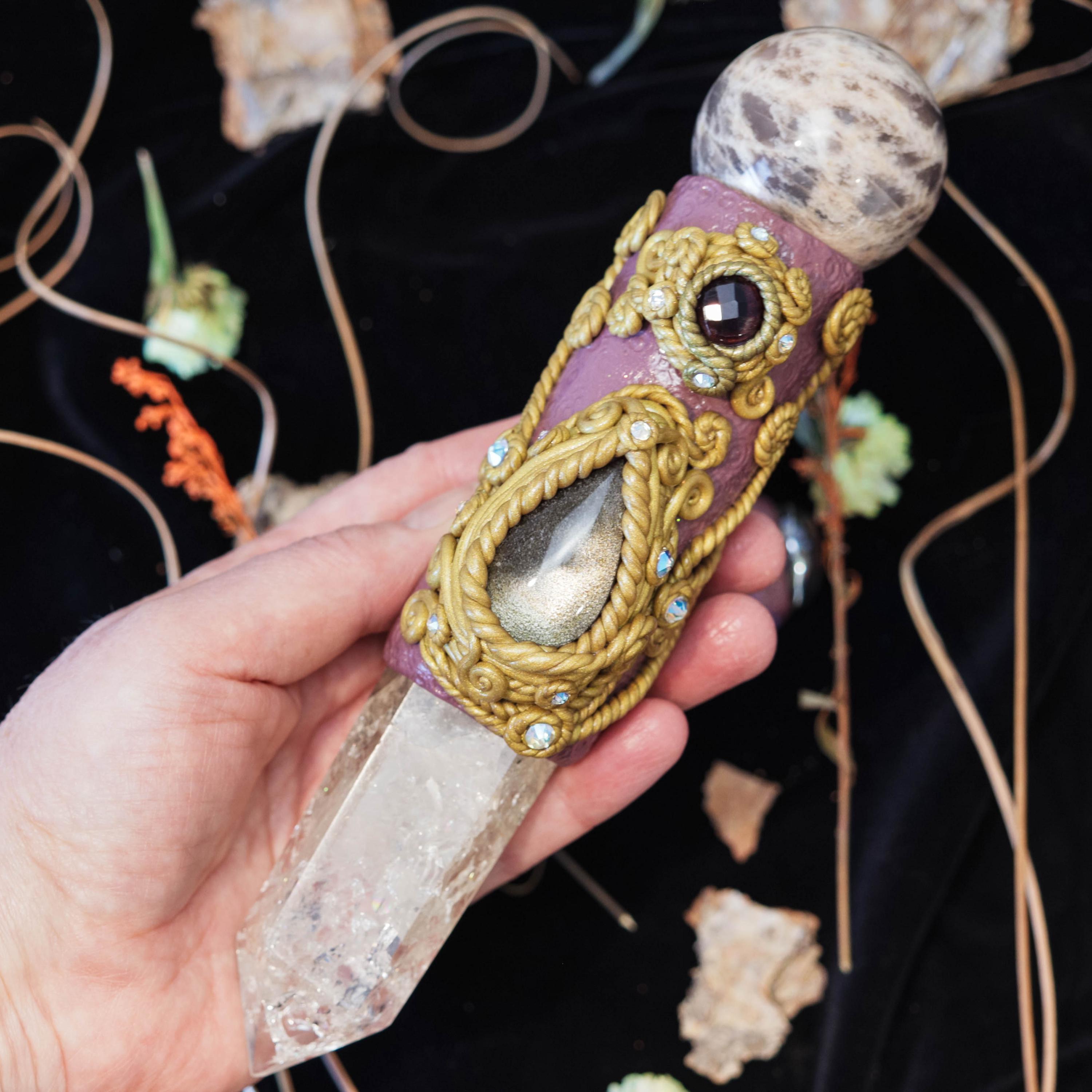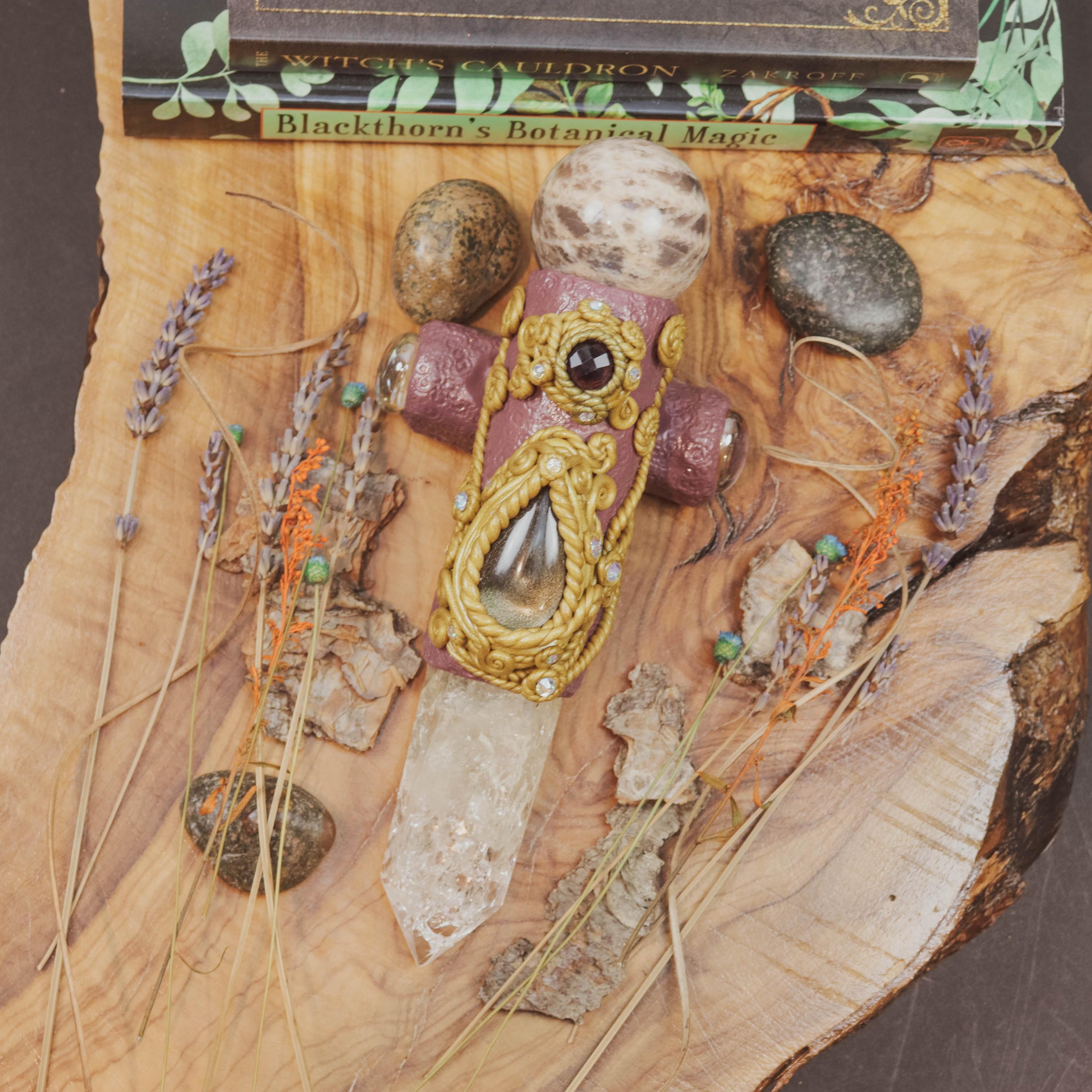 This wand carries the triple essence of Hecate — intuition, transformation, and protection. Use it in ritual to seek her guidance at life’s crossroads, to clear energy, or to manifest new beginnings under her watchful moonlight.