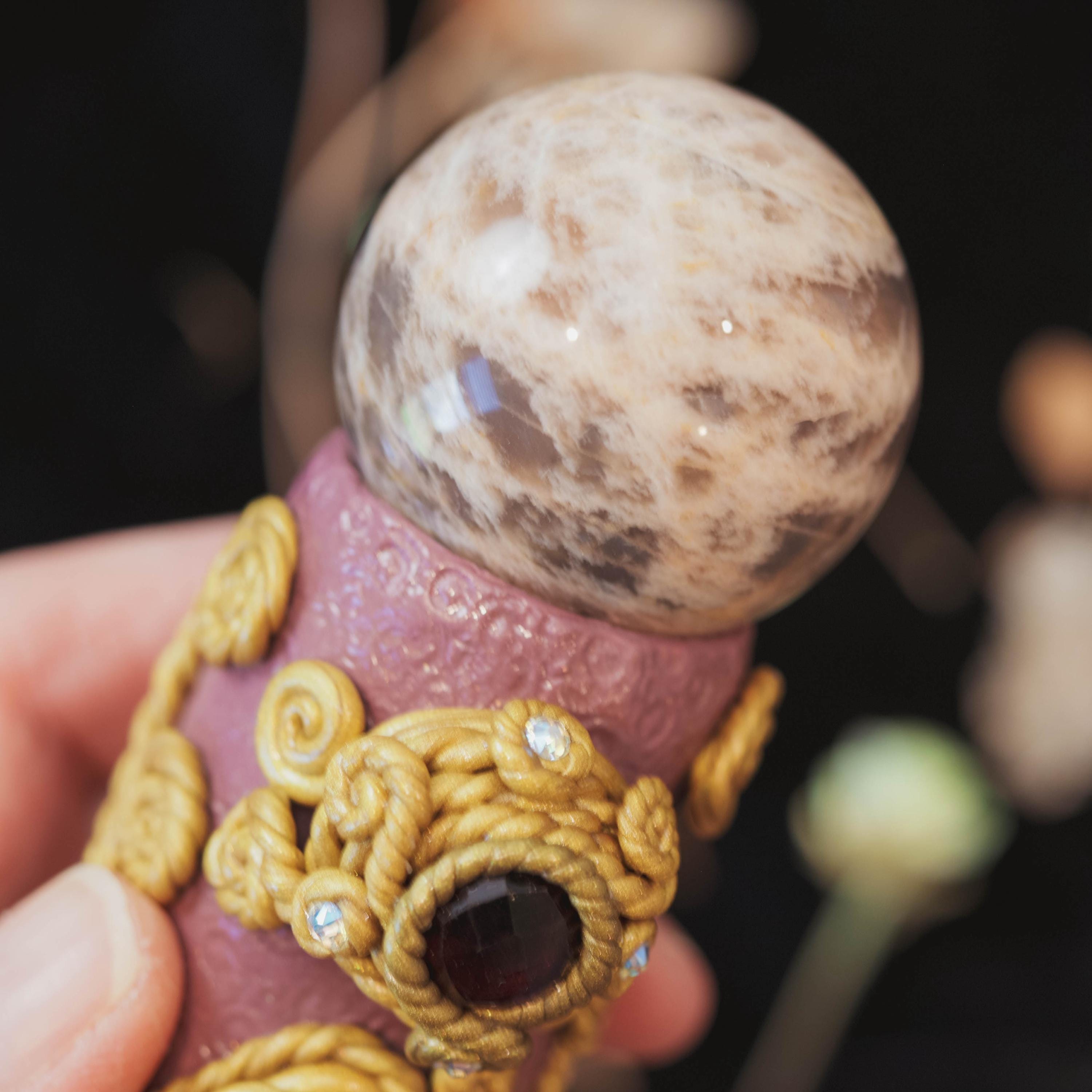 🌕At the crown rests a radiant 41 mm Peach and Grey Moonstone sphere, glowing with soft lunar energy. Peach and Grey Moonstone nurtures the heart, soothing emotional wounds and awakening divine feminine energy. It deepens intuition and psychic awareness, making this stone a favorite for shadow work and connecting to lunar cycles. Together, they create a perfect balance of tenderness and strength — mirroring Hecate’s dual nature as nurturer and protector.